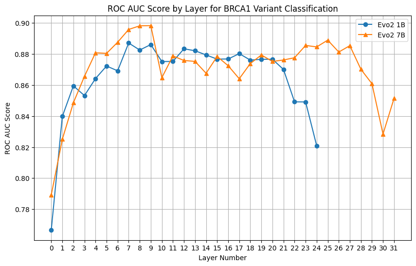 We honestly don’t know which layer is the best, so let’s repeat the AUC calculation for all layers. Here’s the AUC values for all layers using the 1B and 7B models.