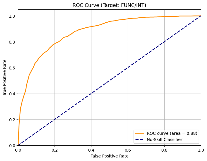 Running through the notebook gives a comparison between the model’s prediction (x-axis) vs the experimental classification (y-axis). Here, FUNC/INT indicates the mutation is benign and doesn’t affect the protein’s function. LOF stands for loss-of-function.